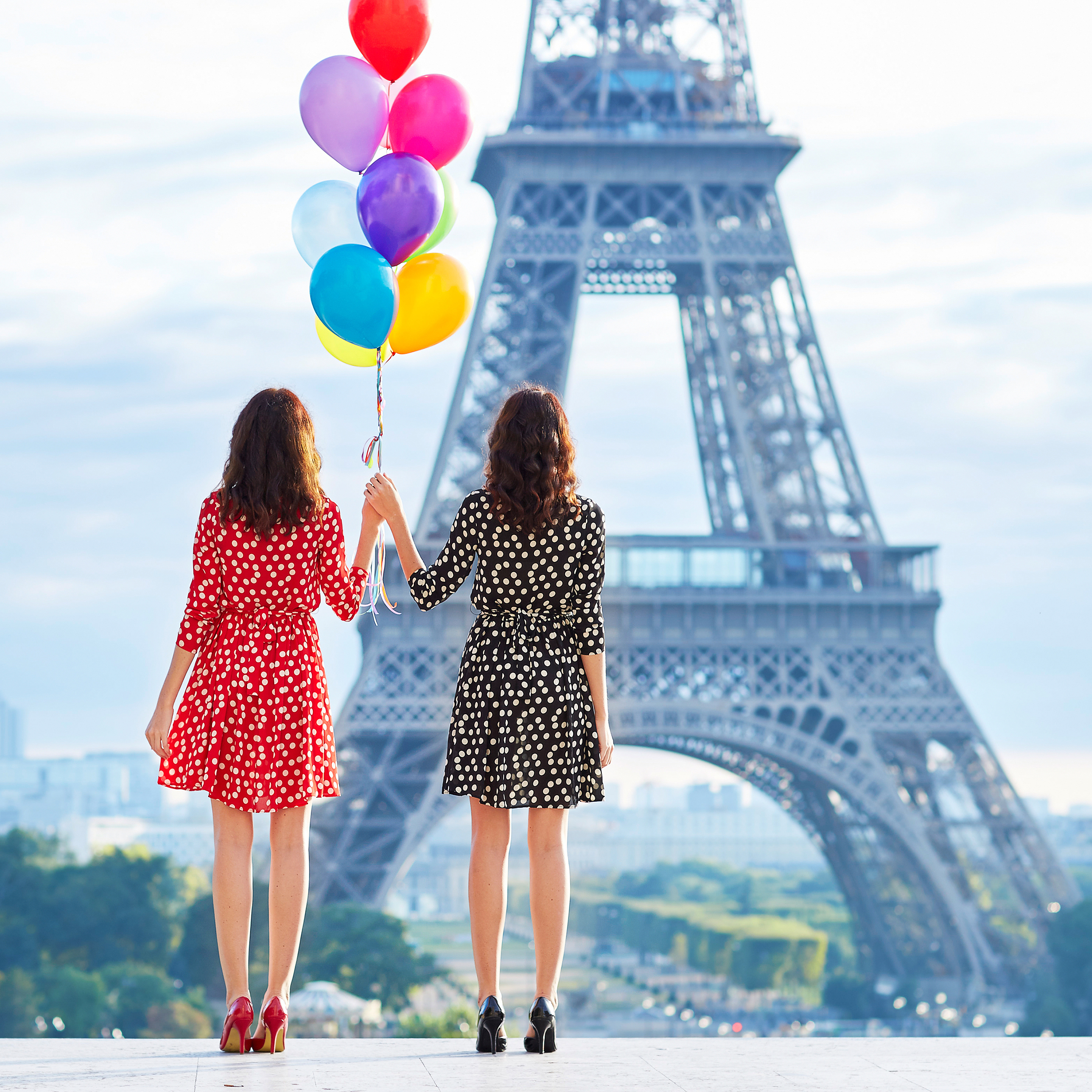 Beautiful twin sisters in red and black polka dot dresses with huge bunch of colorful balloons in front of the Eiffel tower in Paris, France