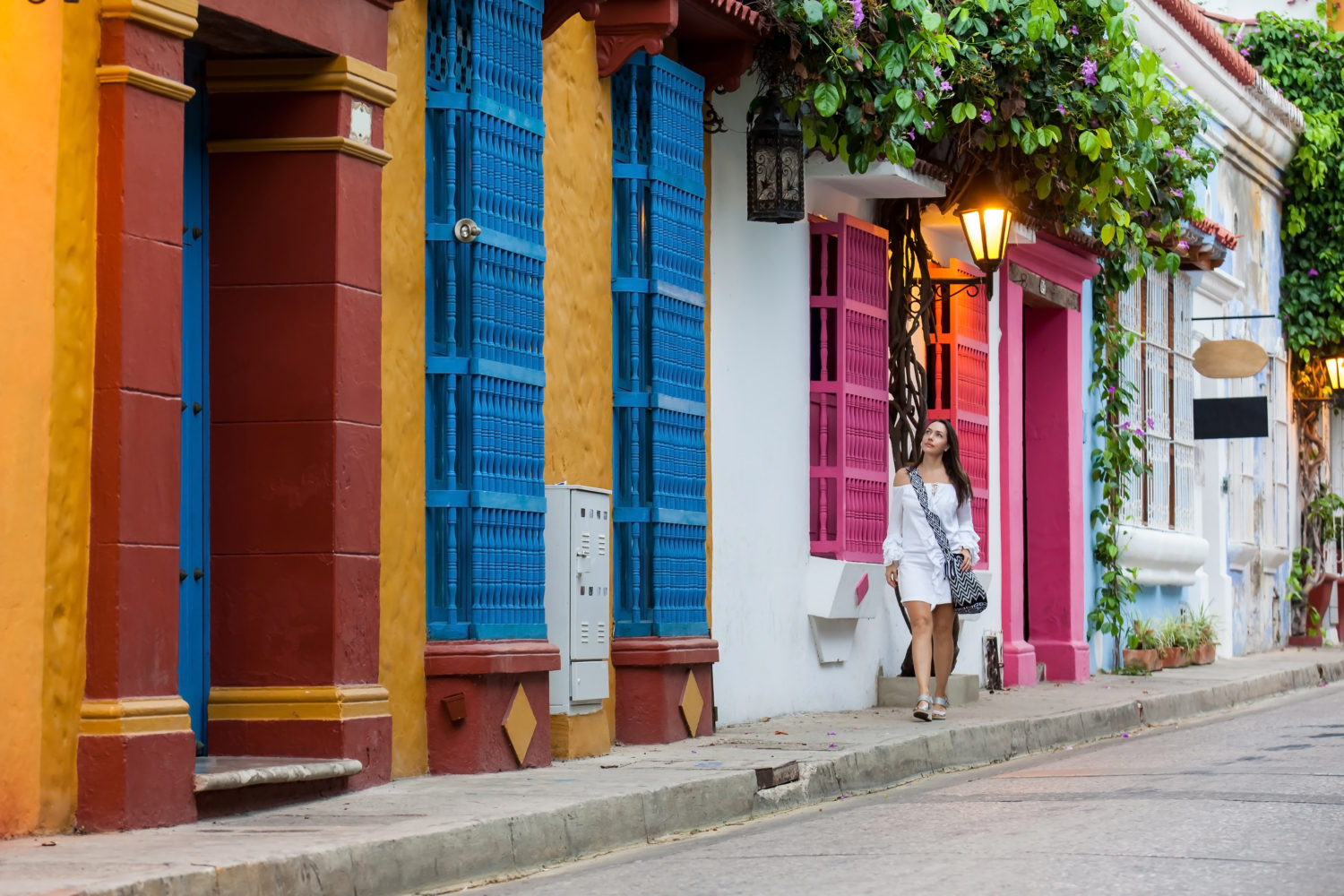 Beautiful woman on white dress walking alone at the colorful streets of the colonial walled city of Cartagena de Indias