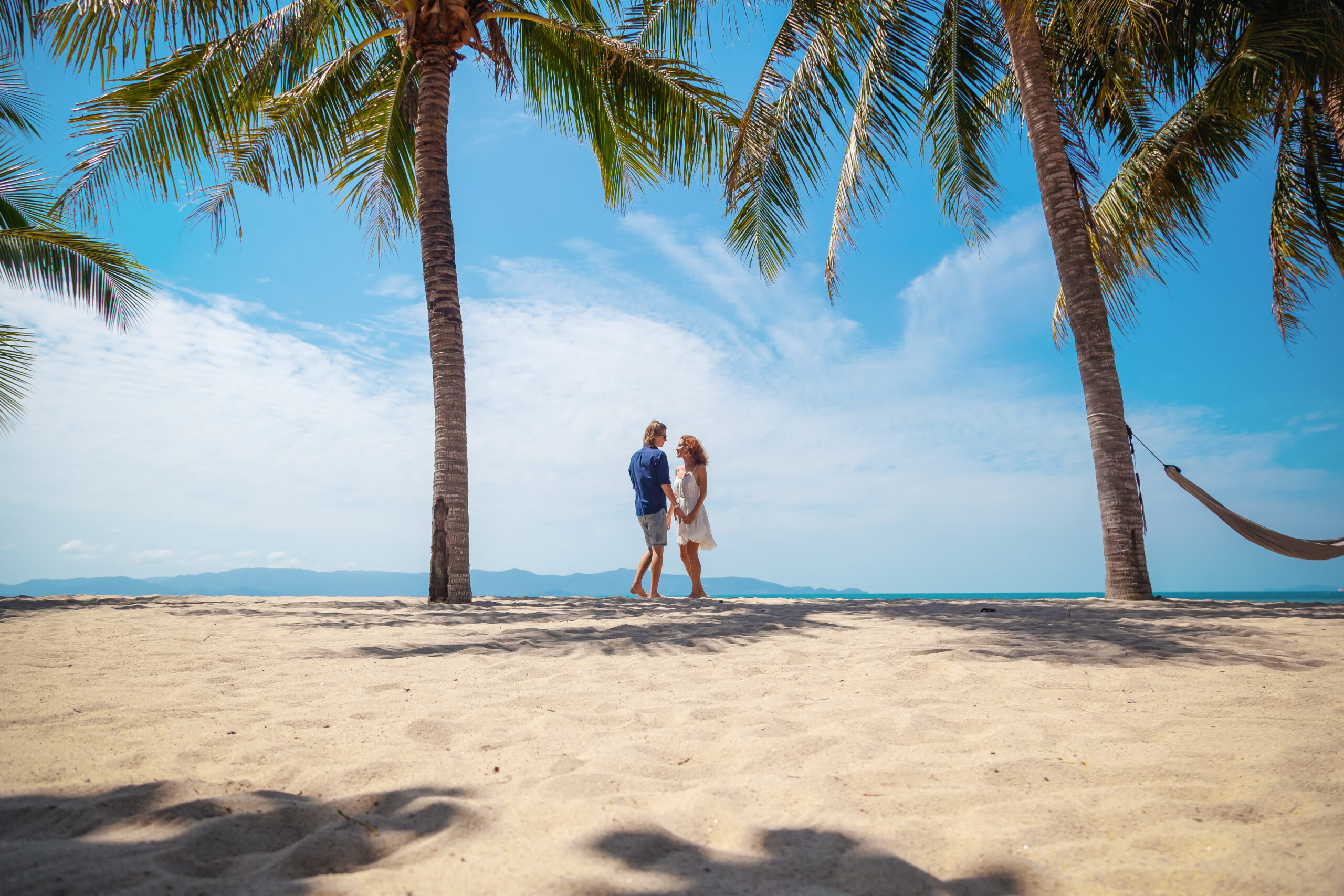 Beautiful young couple walking along the seashore amid a bright tropical beach