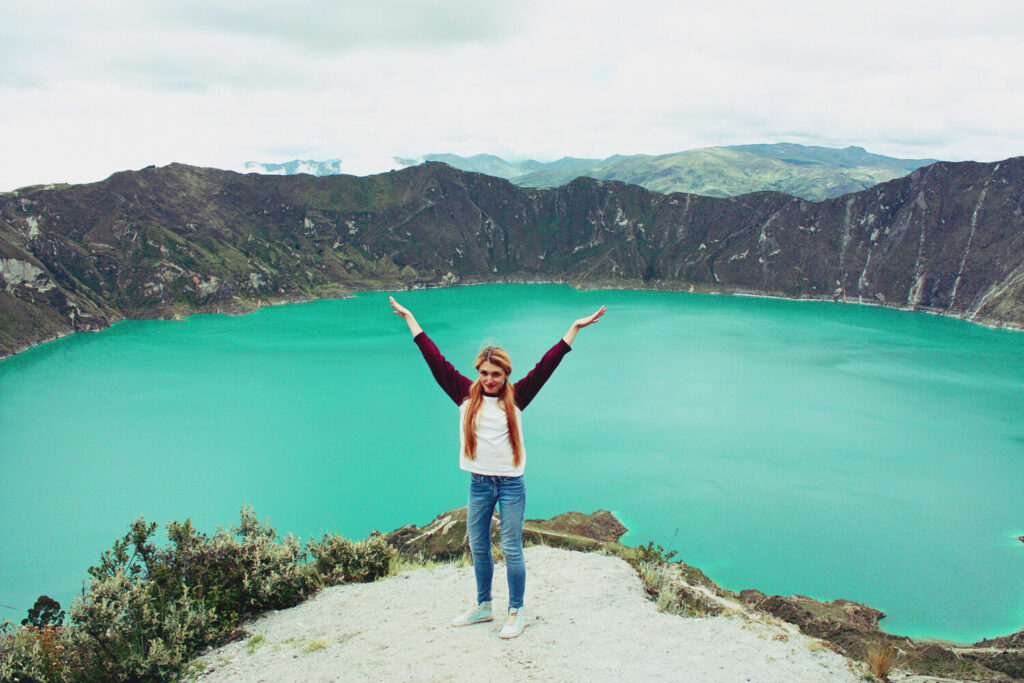 bella chica levanta manos al aire en el crater de ID: 88986 bella chica levanta manos al aire en el cráter de Quilotoa, Ecuador
