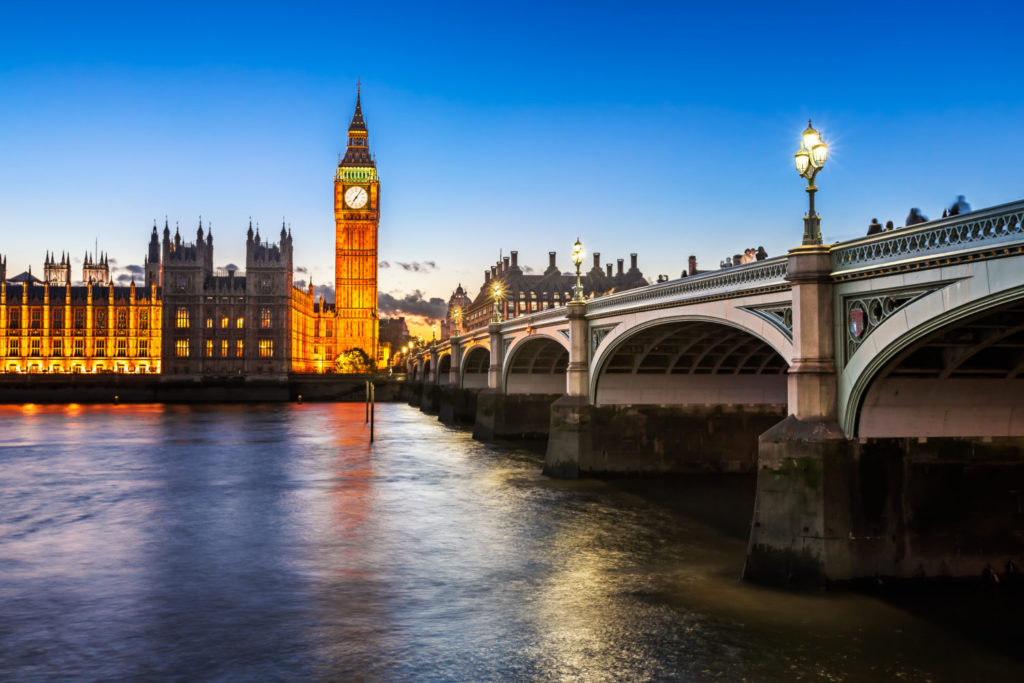 Big Ben and Wesminster Bridge Illuminated in the Evening, London, United Kingdom