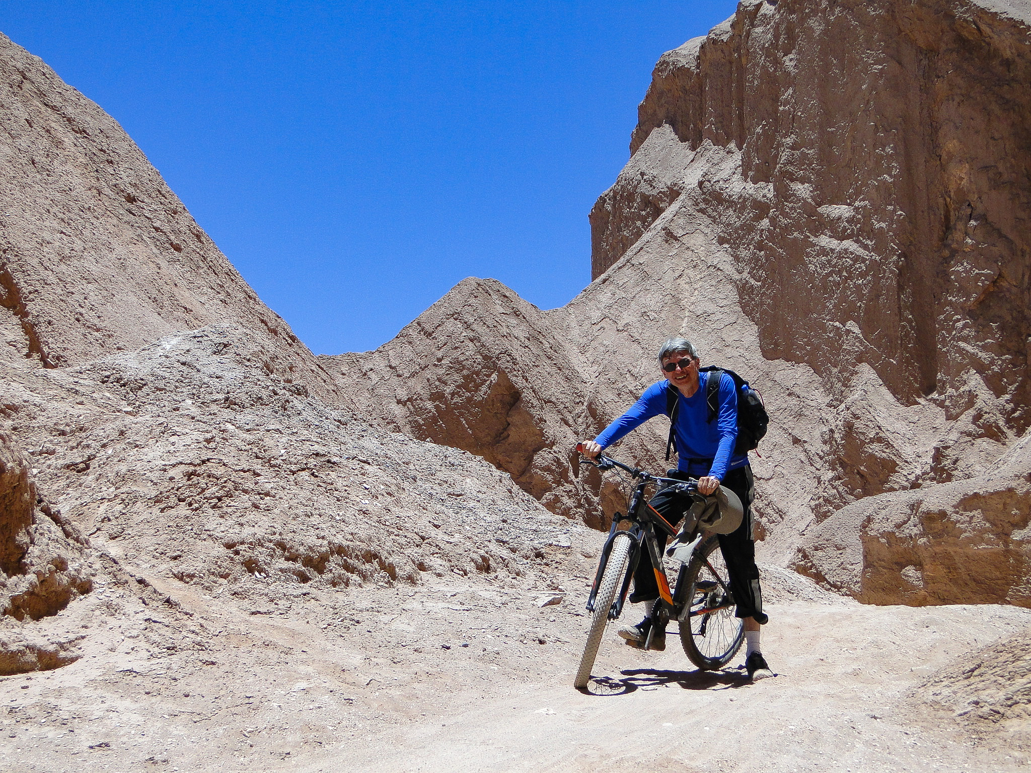 Man on a bike with sedimentary rocks in the background