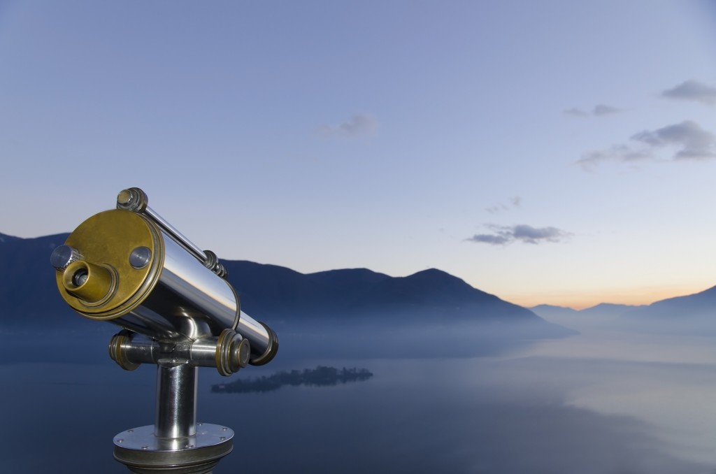 Binoculars With A View Of A Mountainous Landscape And Fog Over Lake Maggiore, Isole Di Brissago, Ticino, Switzerland ID: 21894