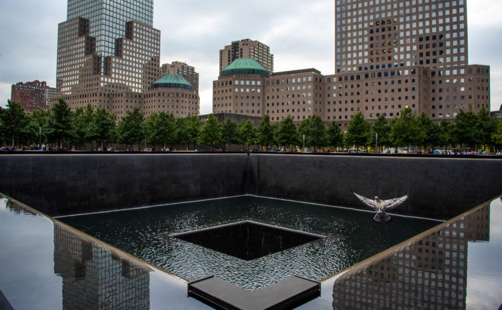 Bird in flight over 9 11 Memorial fountain in New York Manhattan