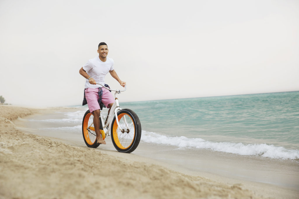 Black man riding bicycle on beach