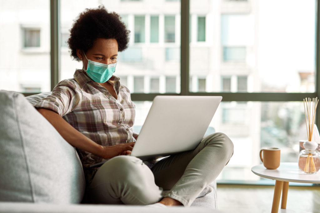 Black woman wearing face mask while working on a computer at home during virus epidemic.