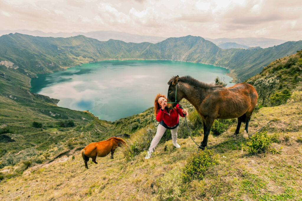 blonde woman playing with two horses in the lake quilotoa ID: 88906 Blonde Woman Playing With Two Horses In The Lake Quilotoa, Ecuador