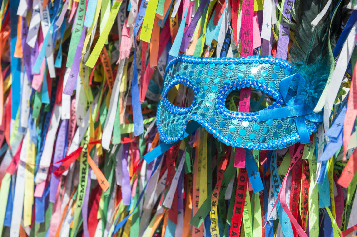 Blue sequined carnival mask in a background of Brazilian wish ribbons Salvador Bahia Brazil