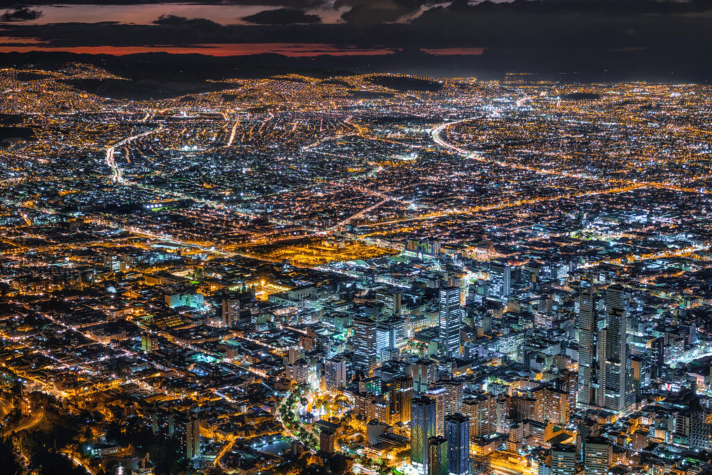 Bogotá, Colombia, vista del paisaje urbano con edificios del centro iluminados al atardecer.