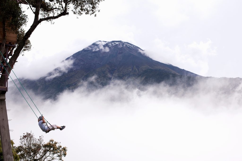 Boy on the Swing at the End of the World with Tungurahua volcano in background, Ecuador