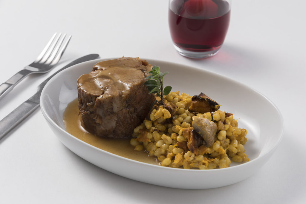 Braised pork shoulder with orzo risotto and apples demi glace