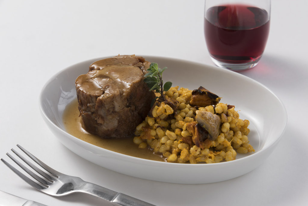 Braised pork shoulder with orzo risotto and apples demi glace