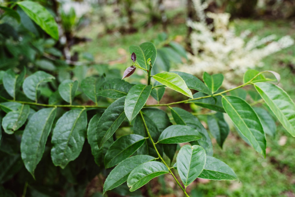 branch of fresh green guayusa tea leaves in amazon rainforest