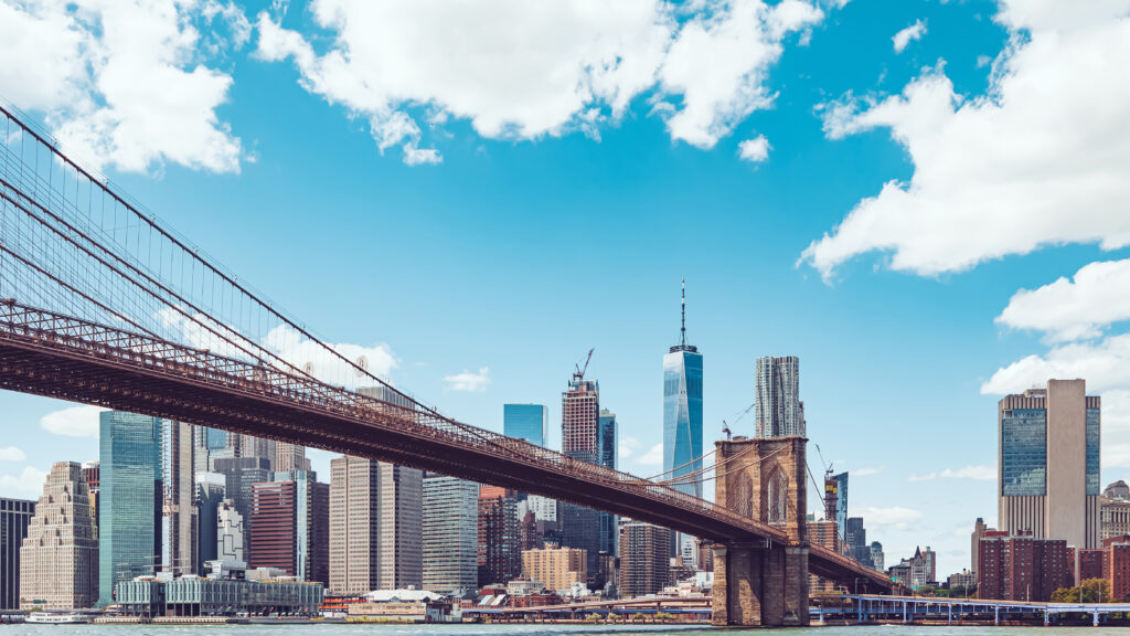 Brooklyn Bridge panoramic view against Lower Manhattan district and blue sky. New York, Manhattan, USA