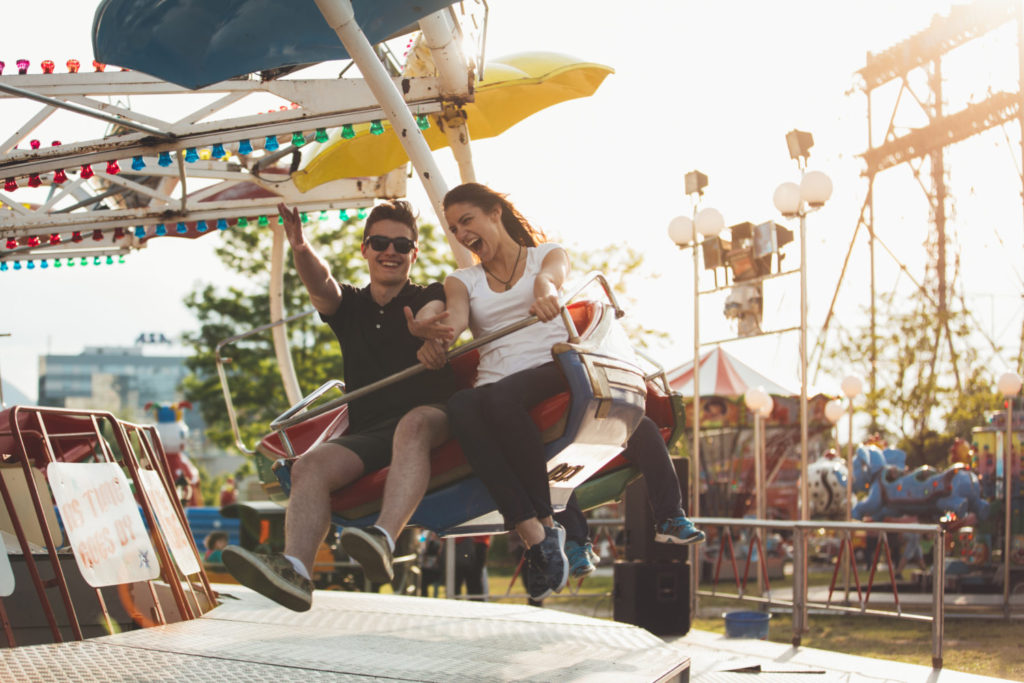 Brother and sister having a ride at an amusement park. Spending free time together. Bonding and entertainment concept.Beautiful sunset at theme park in summer holiday vacation.