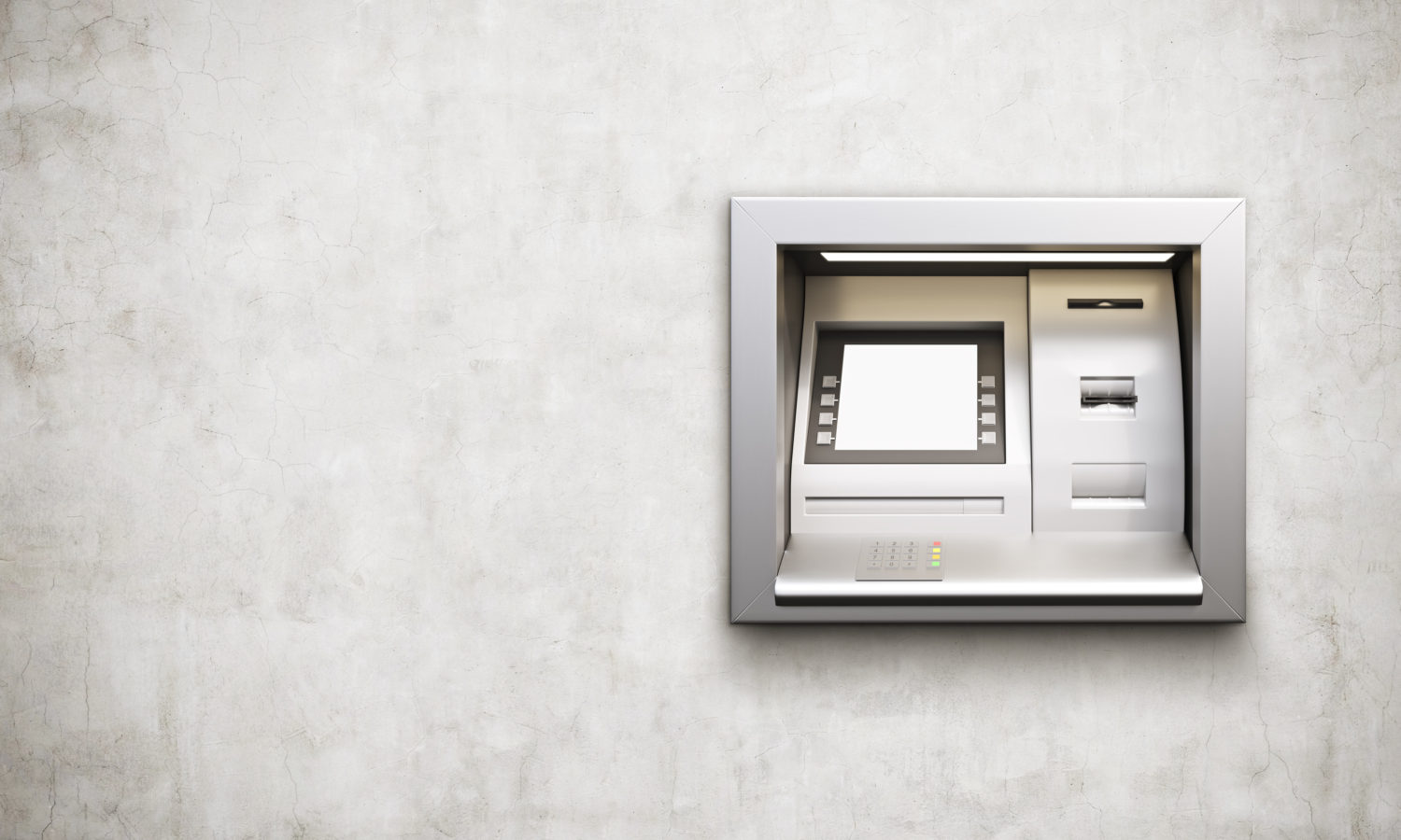 Built-in ATM machine with blank display on concrete background. Mock up, 3D Rendering