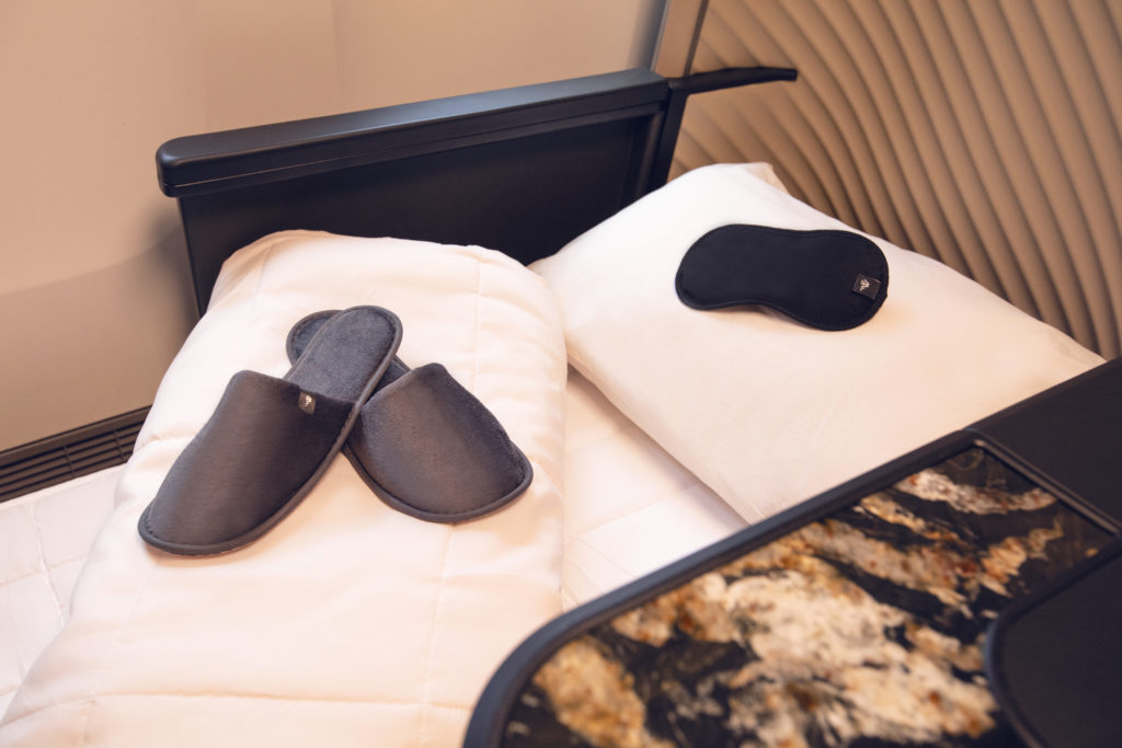 Business class seat with slippers and sleeping mask