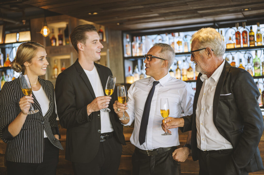 Business people having fun talking and discussion with while drinking champagne at business success party.