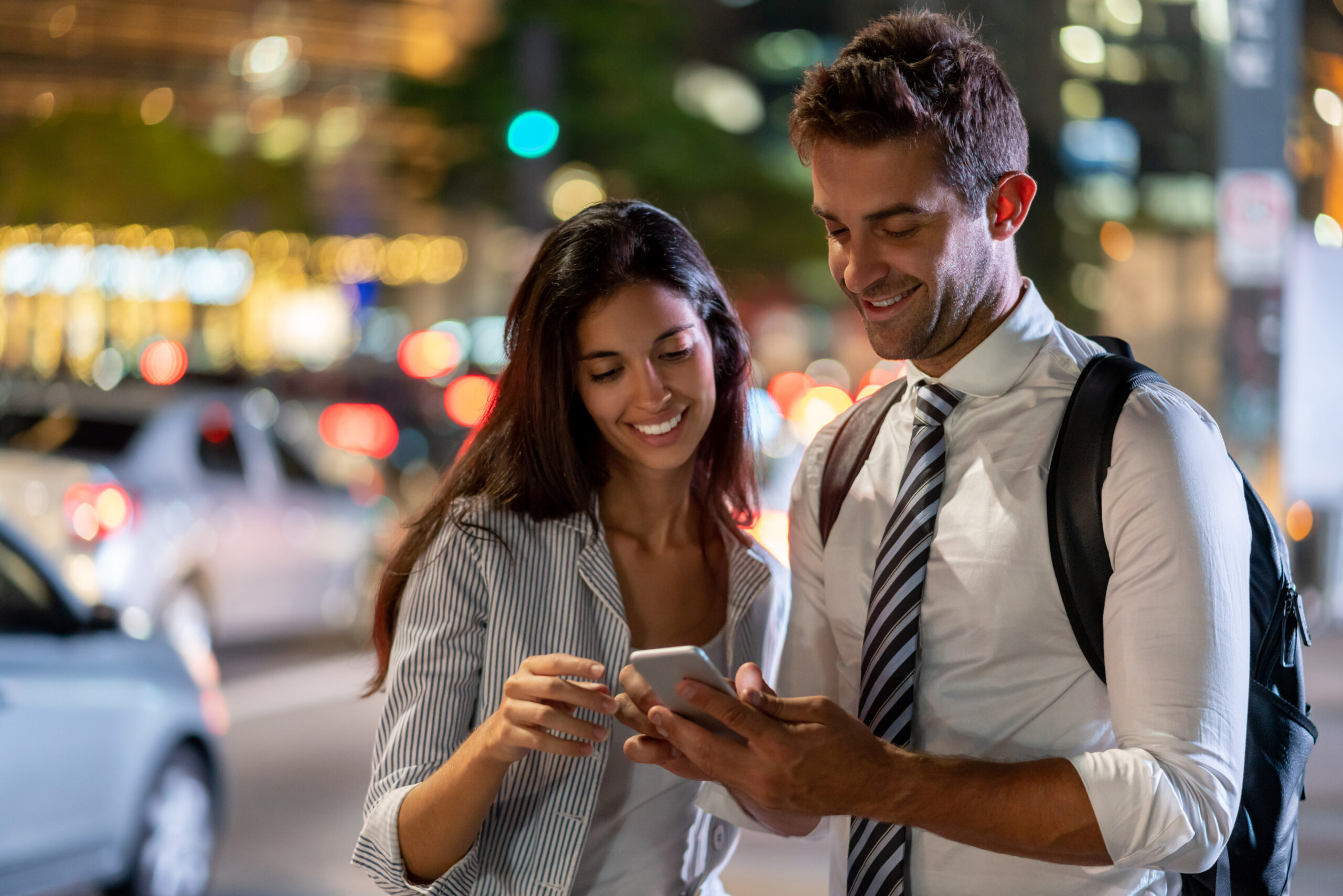 Portrait of a business people using app on a cell phone on the street at nighttime and looking very happy