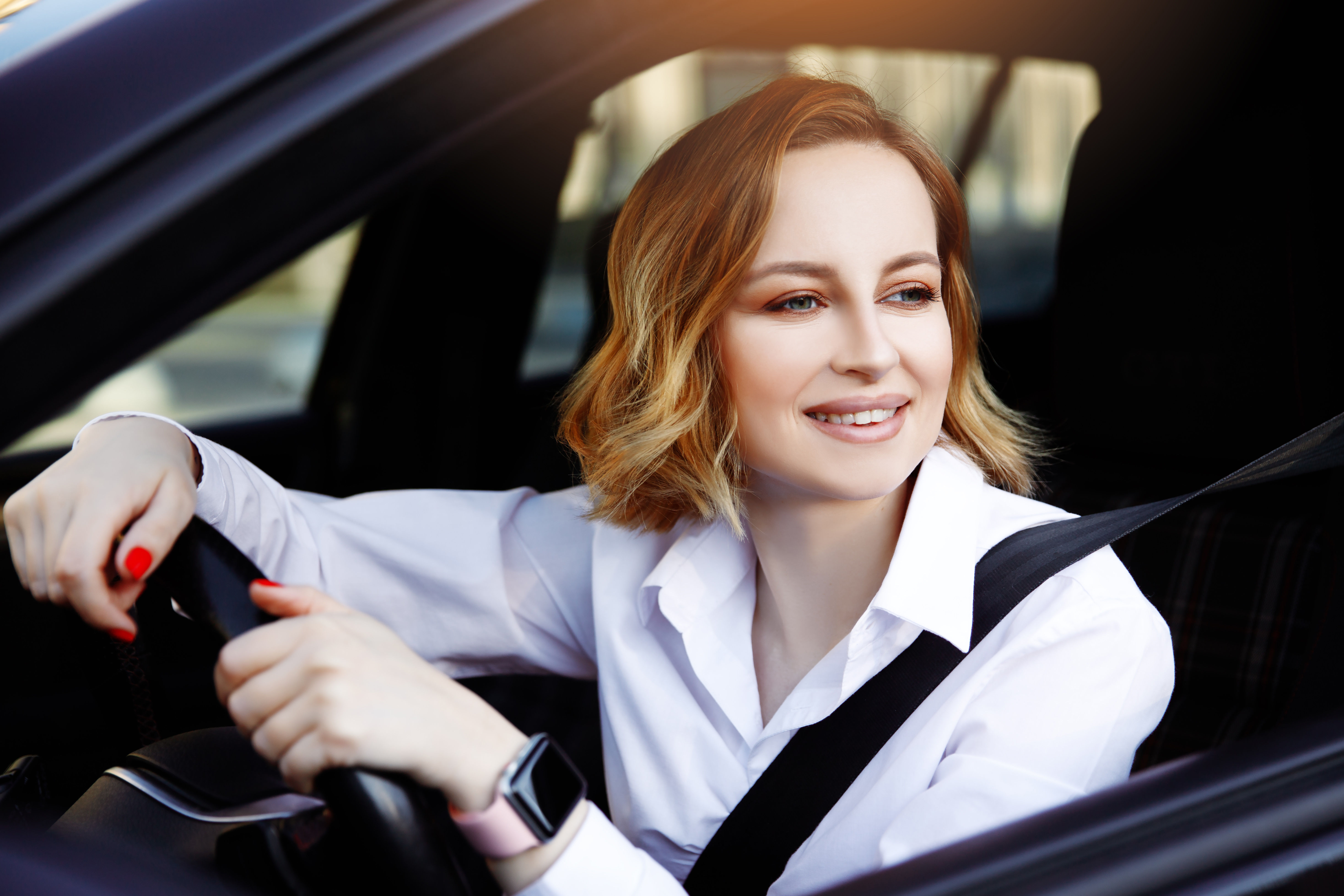 business woman in white shirt new driver sitting in car