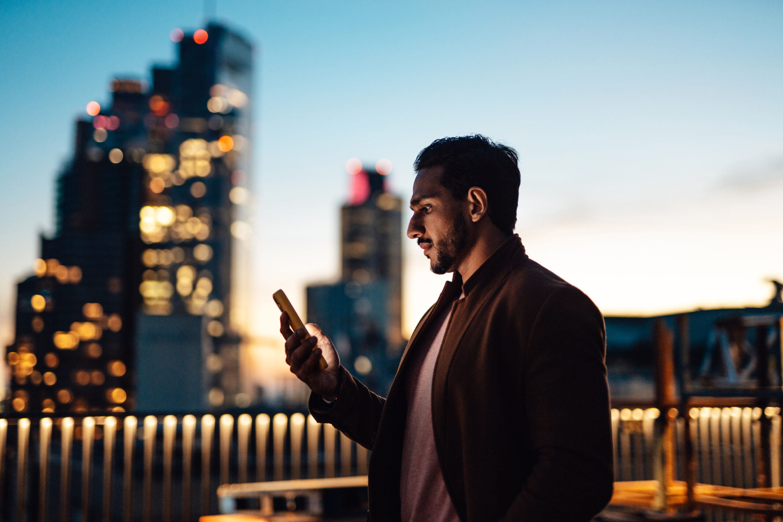 Businessman using mobile phone at rooftop in business building against illuminated financial buildings and London cityscape at night.
