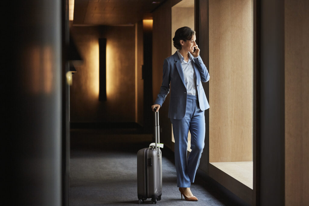 Full length of businesswoman talking on smart phone in corridor. Female entrepreneur is standing with wheeled luggage. She is in hotel.