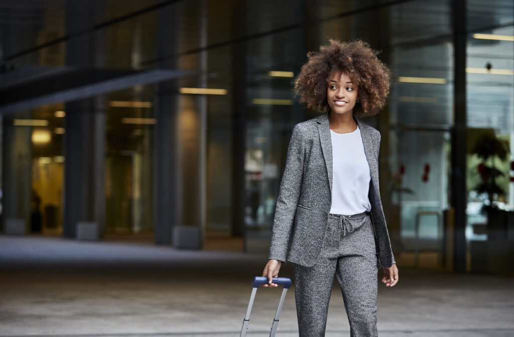 Businesswoman with luggage walking outside office