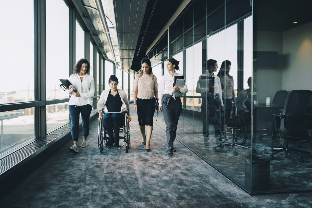 Businesswomen walking with disabled female entrepreneur in corridor at workplace