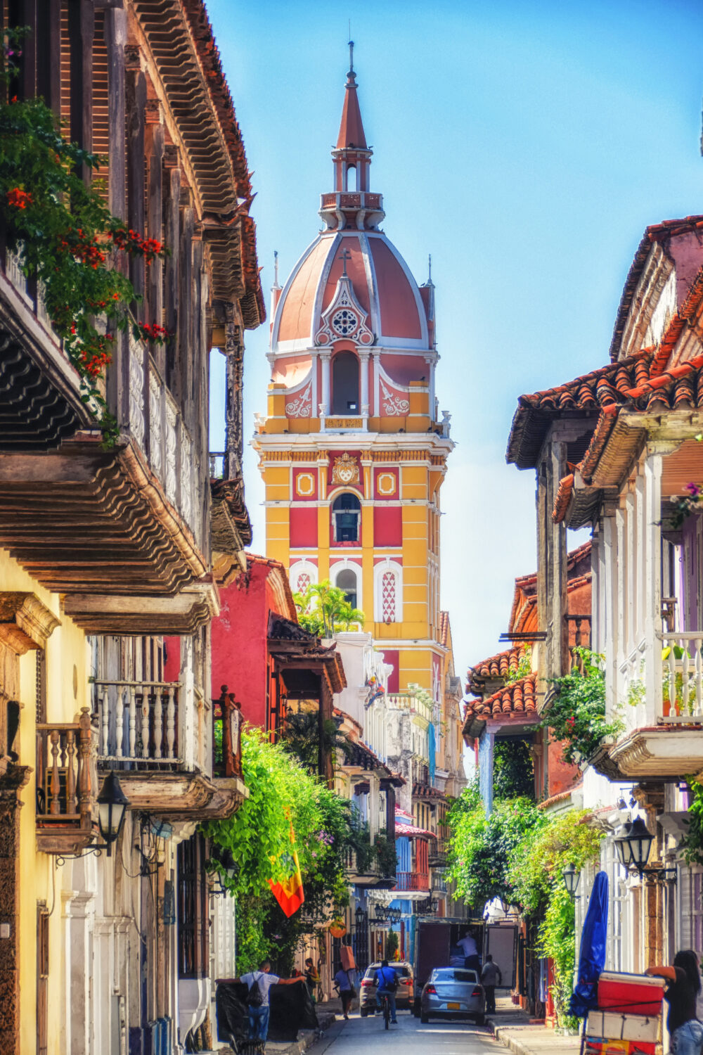 Calle en Cartagena, Colombia con una hermosa torre de iglesia que domina una calle con balcones envueltos en buganvillia