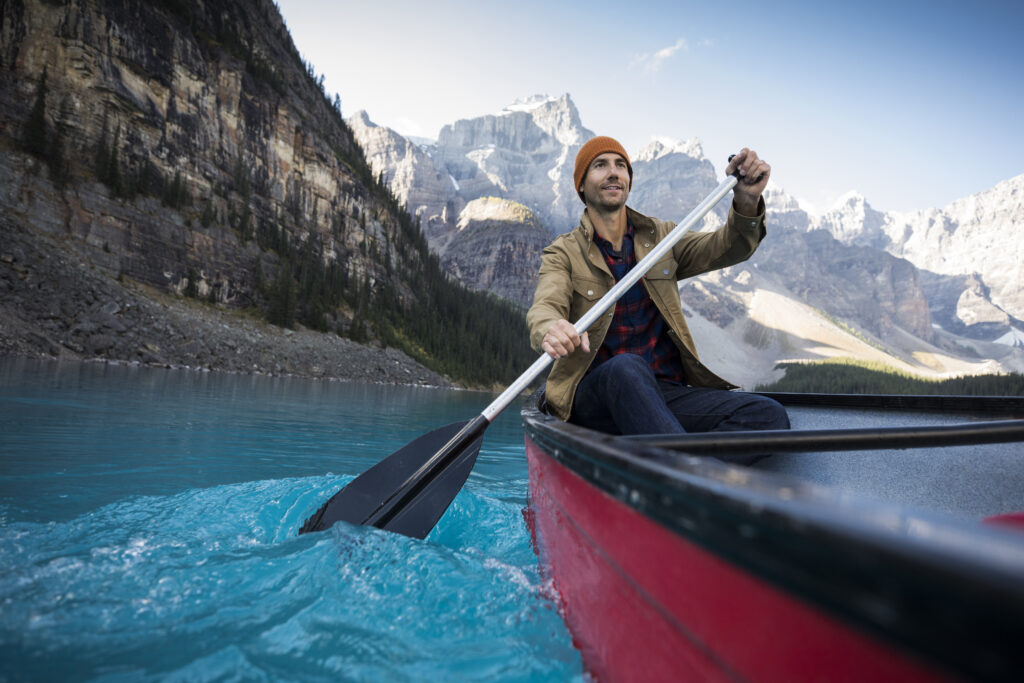 Canoeing on a turquoise lake ID: 78096 A young man taking in the scenic view over Lake Moraine from a canoe