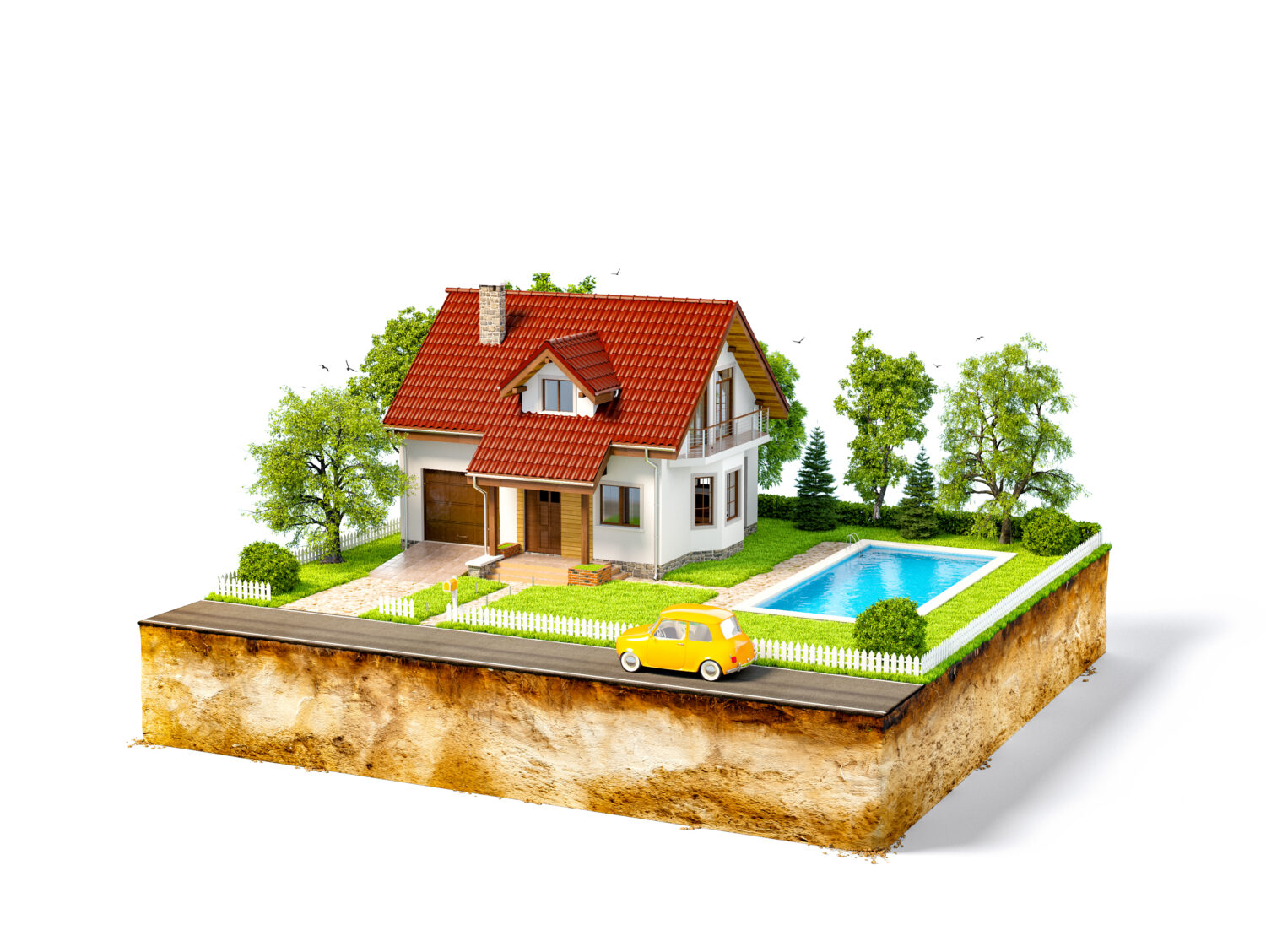 Casa blanca de ensueño en un trozo de tierra con valla blanca, jardín, piscina y árboles. Inusual ilustración creativa 3d aislada en fondo blanco