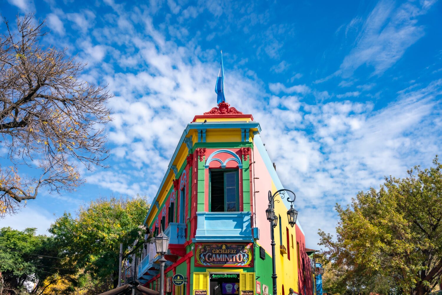Casas pintadas de manera vibrante en Caminito, barrio de La Boca de Buenos Aires, mostrando el rico patrimonio cultural y artístico de la zona.