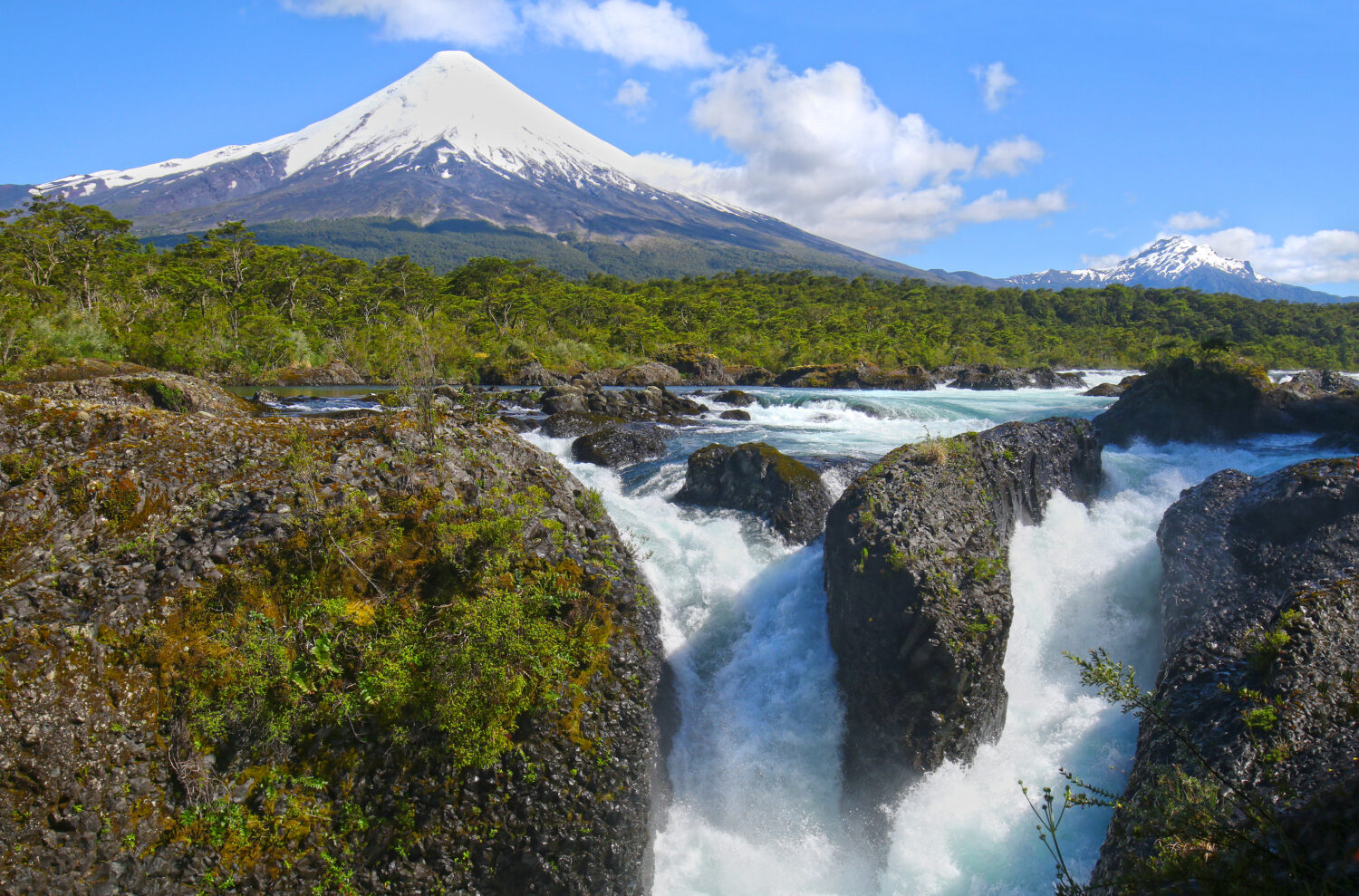 Cascadas Petrohue con Volcán Osorno en el fondo. Cerca de la Ciudad de Puerto Varas, Chile.