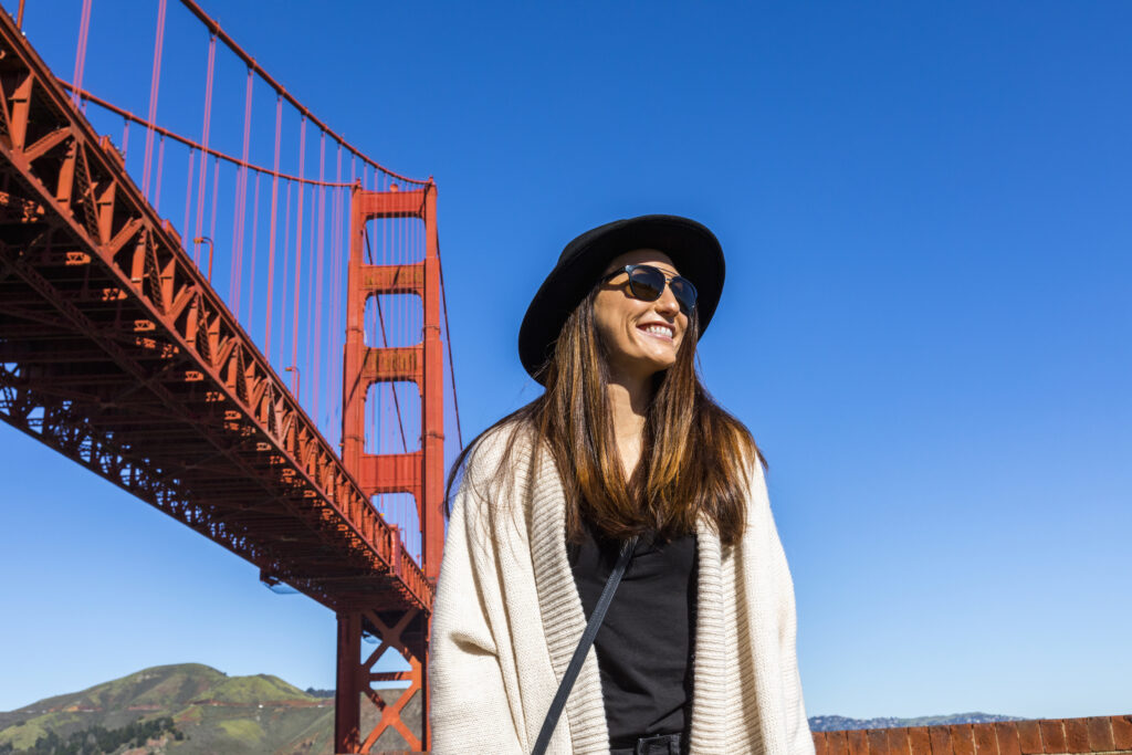 Caucasian woman near Golden Gate Bridge, San Francisco, California, United States