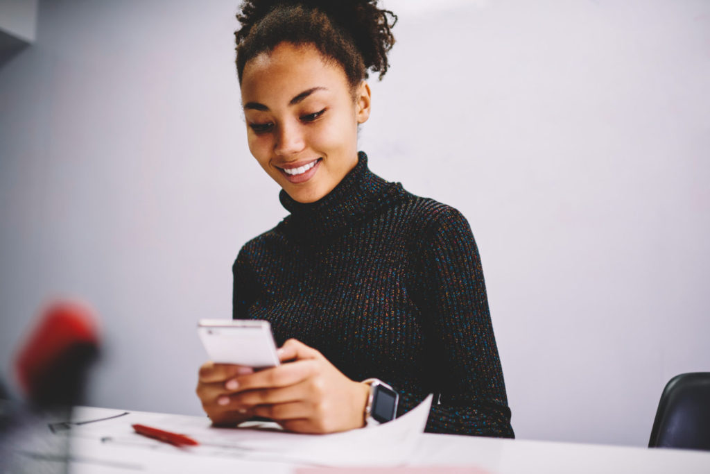 Cheerful african american woman reading good news from income message on cellular sitting at office, smiling dark skinned female student confirming new friend in social network using telephone