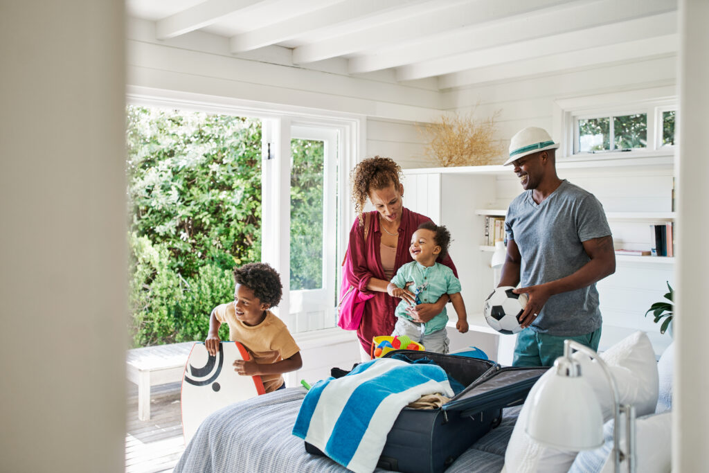 Cheerful black family packing for a family vacation in their home or a hotel room. Parents and their two kids putting towels and toys in a suitcase for holiday by the beach. Time for a fun adventure