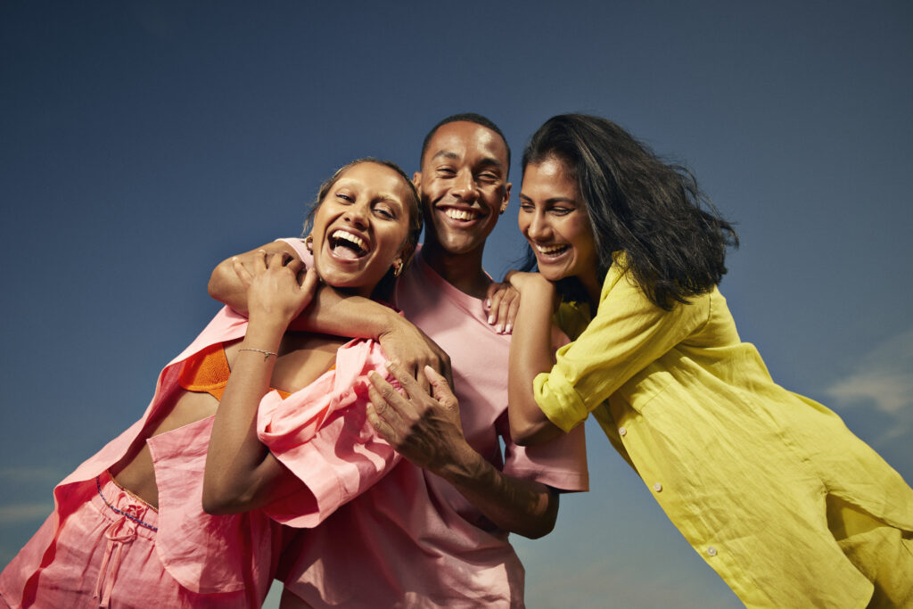 Cheerful friends laughing against sky ID: 78048 Low angle portrait of cheerful friends laughing while standing against sky