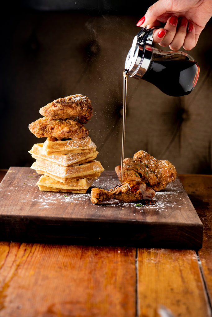 Chicken and waffles. Crispy homemade fried chicken on top of homemade buttermilk waffles topped with butter and maple syrup. Classic American Diner Style Breakfast or Brunch menu item favorite.