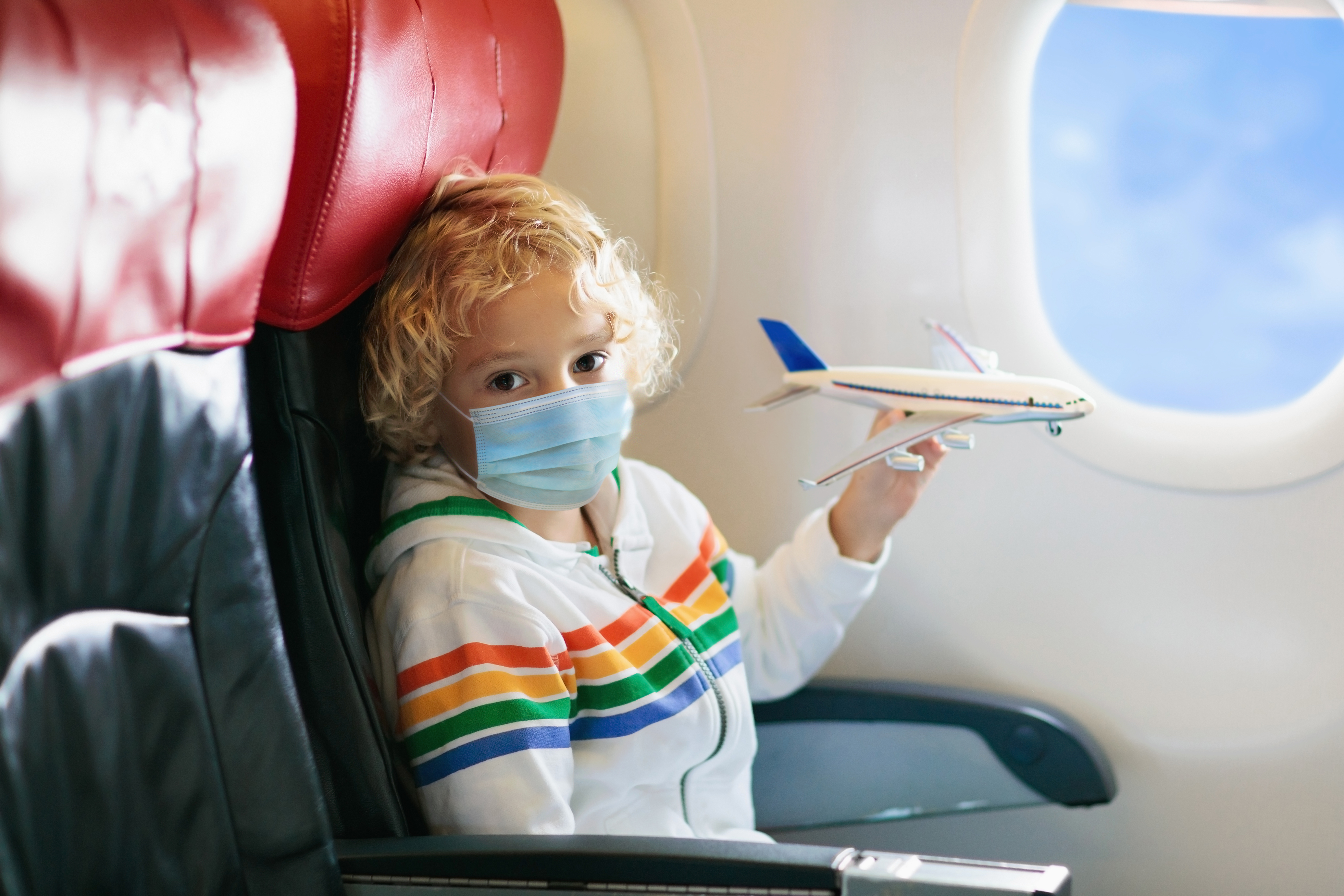 Child in airplane in face mask. Virus outbreak. Coronavirus and flu pandemic. Safe travel with young child and baby. Kids flying airplane in surgical masks.
