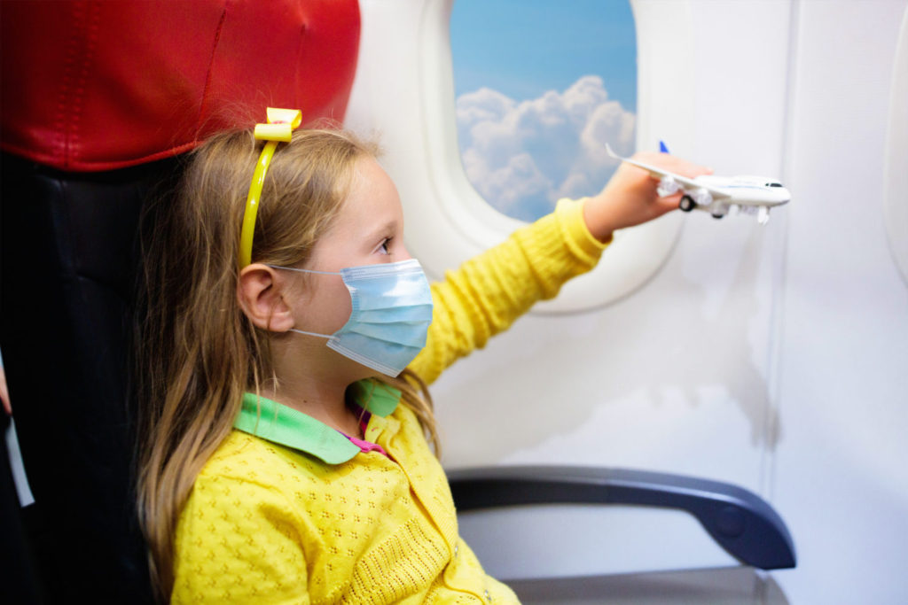Child in airplane in face mask. Virus outbreak. Coronavirus and flu pandemic. Safe travel with young child and baby. Kids flying airplane in surgical masks.