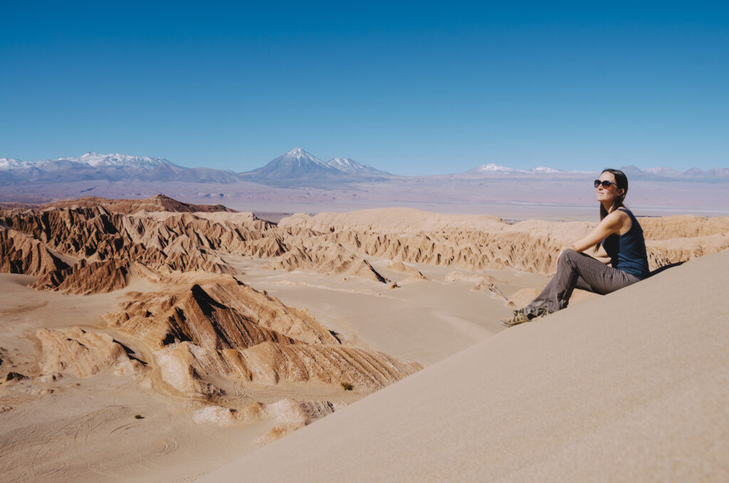 Chile, Atacama Desert, woman sitting on a dune looking at view
