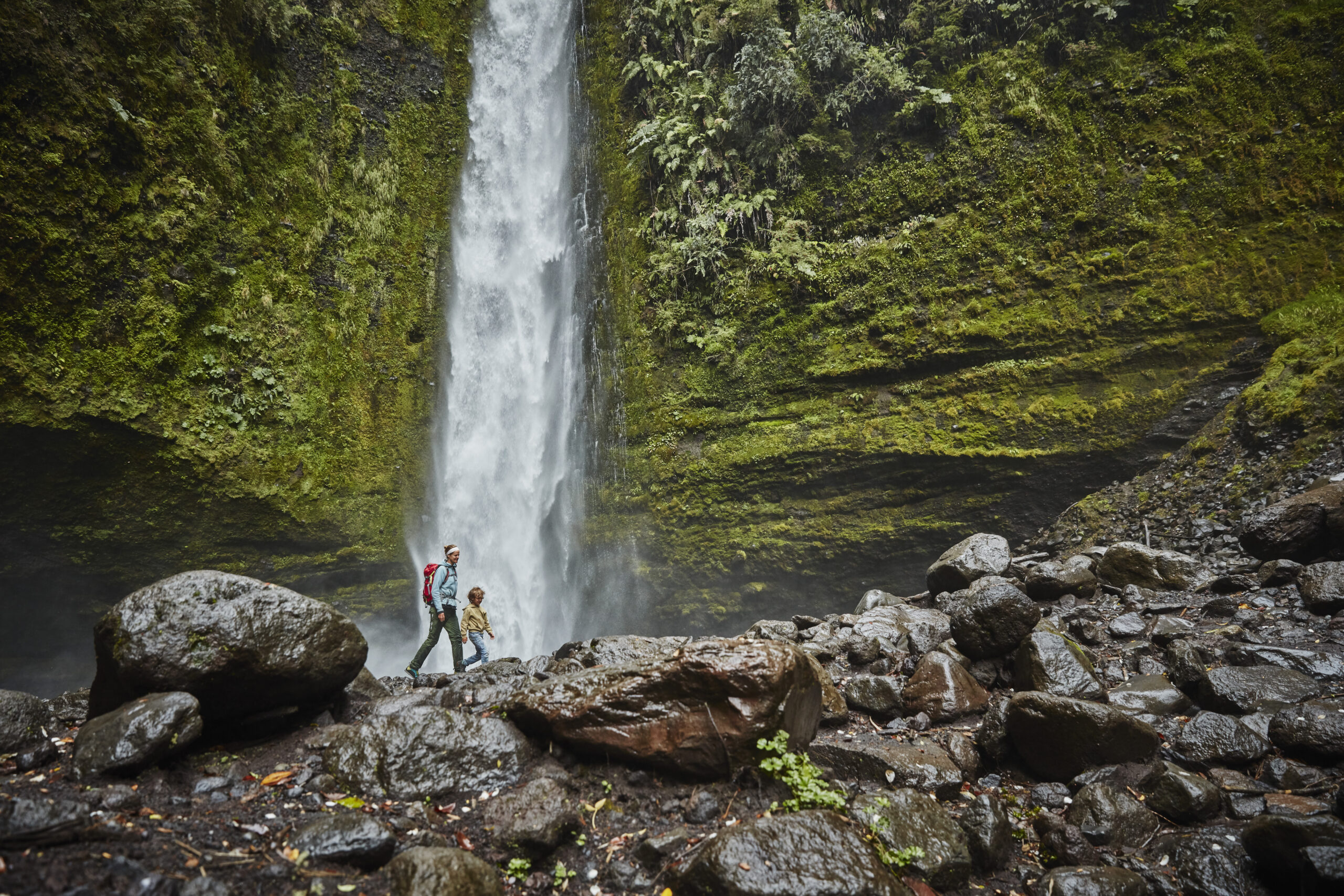 Chile, Patagonia, Osorno Volcano, mother and son walking at Las Cascadas waterfall