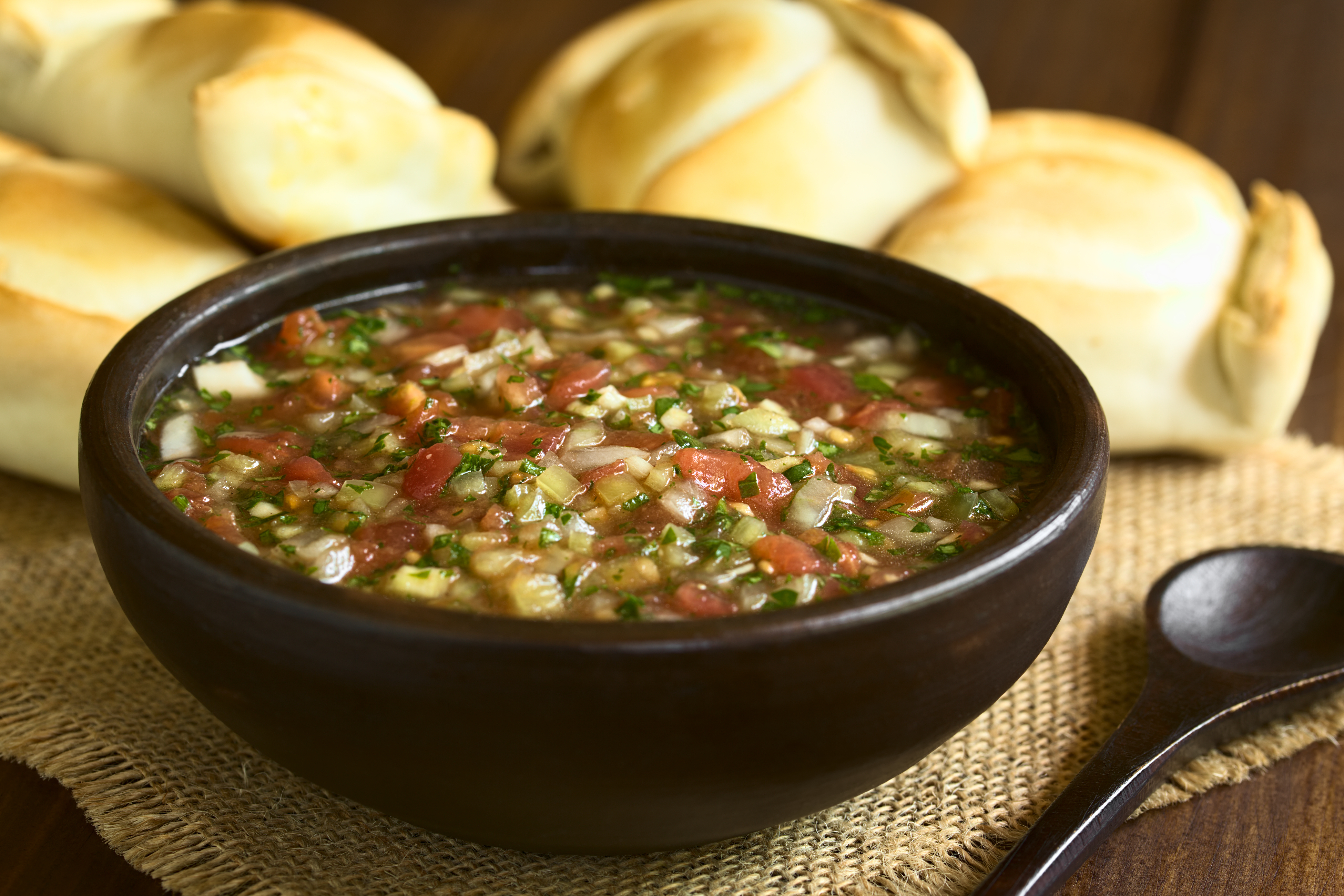 Chilean Pebre sauce, a traditional condiment made of tomato, onion, garlic, spicy aji pepper, coriander, empanadas behind, photographed with natural light (Selective Focus, Focus in middle of pebre)