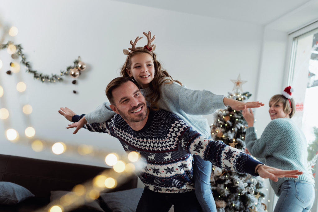 Christmas morning goofing with children ID: 69085 Father carrying daughter piggyback on a joyous Christmas morning