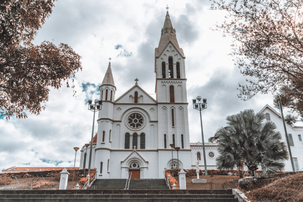 Church “igreja da Gloria” in Brazil, state Minas Gerais, in a small town Juiz de Fora town, with overcast sky in the background and a wide stairway in the foreground, wide-angle shot
