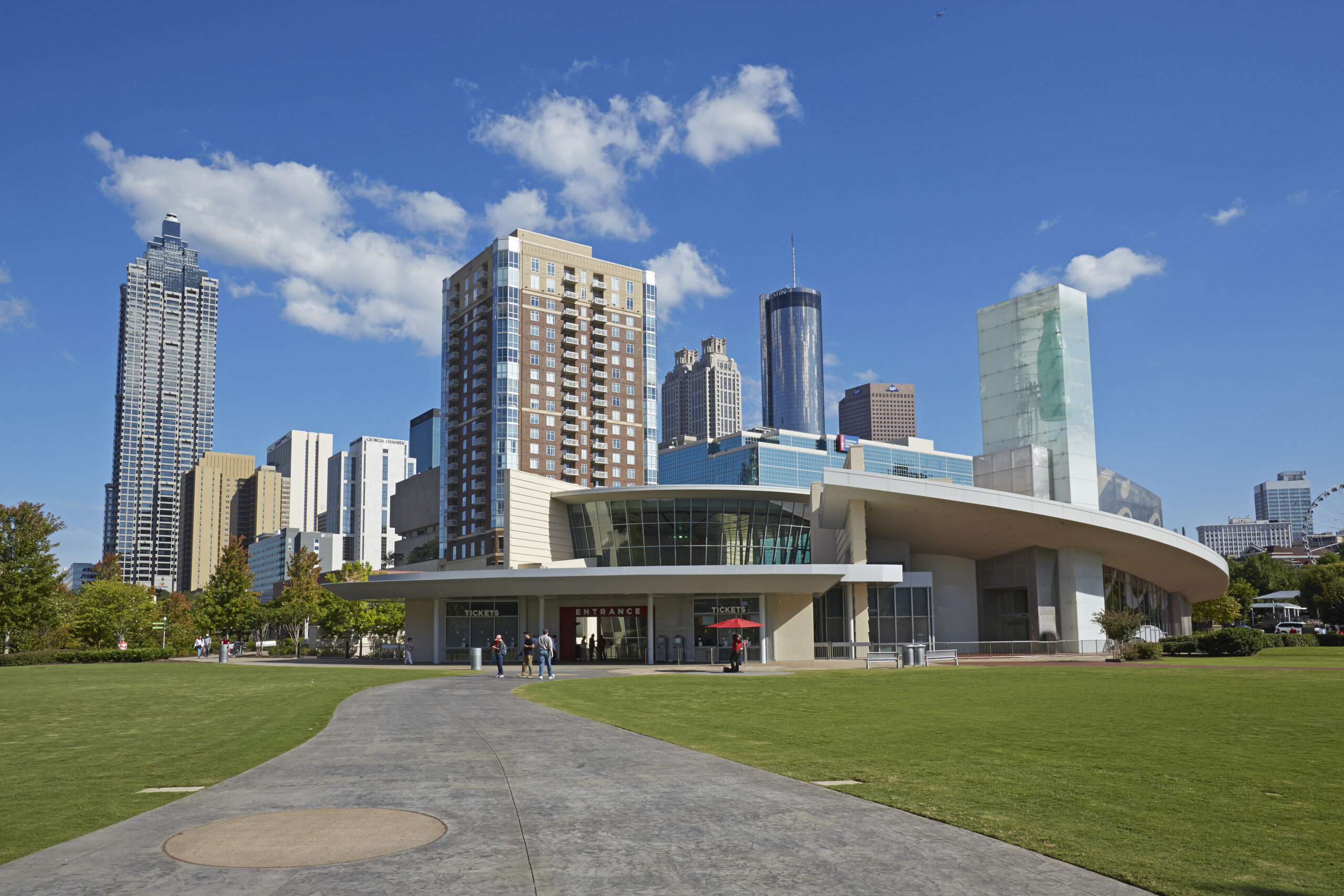Cityscape of the skyscrapers of Downtown Atlanta from the ‘Centennial Olympic Park’ with the ‘World of Coca Cola’ attraction in foreground.