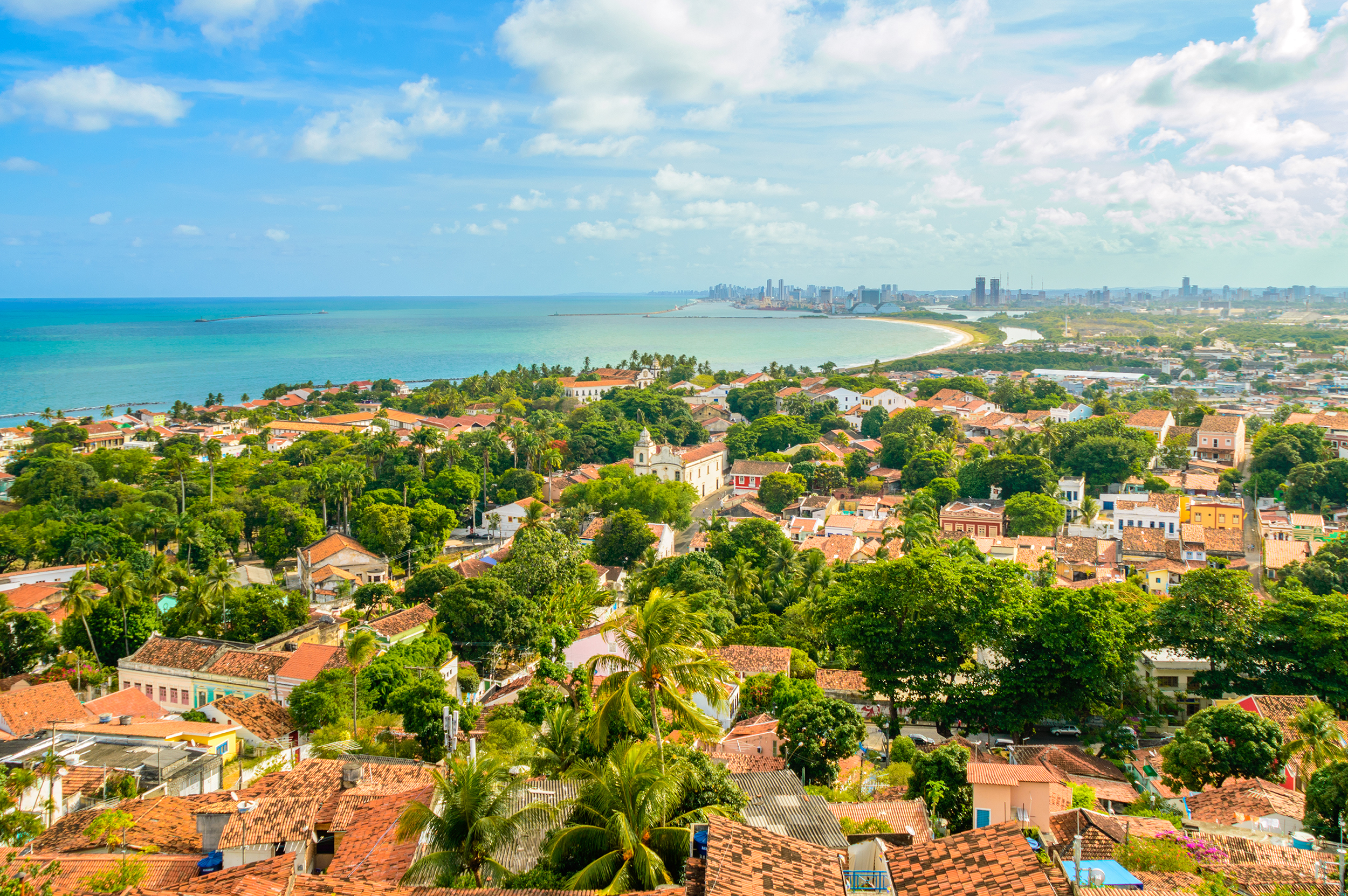 Ciudad brasileña de Olinda, vista aérea con la ciudad de Recife al fondo, con el océano Atlántico y el cielo azul brillante