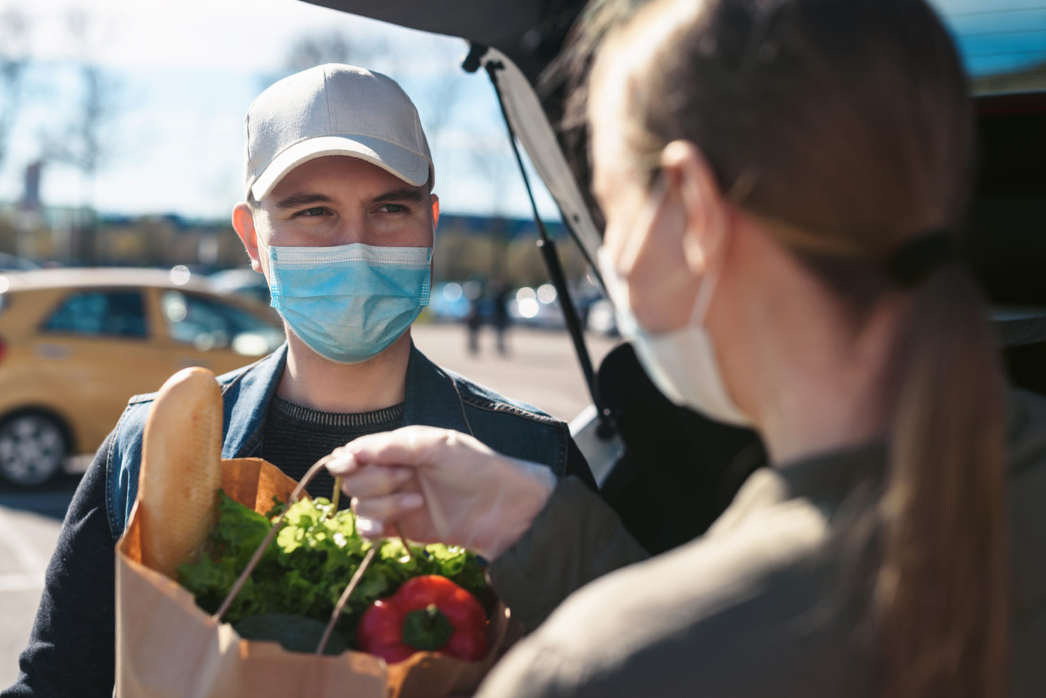 Close up courier in uniform, protective mask and gloves delivers groceries from a supermarket to a young woman. Food delivery and shopping during coronavirus Covid-19 quarantine. Social distancing.