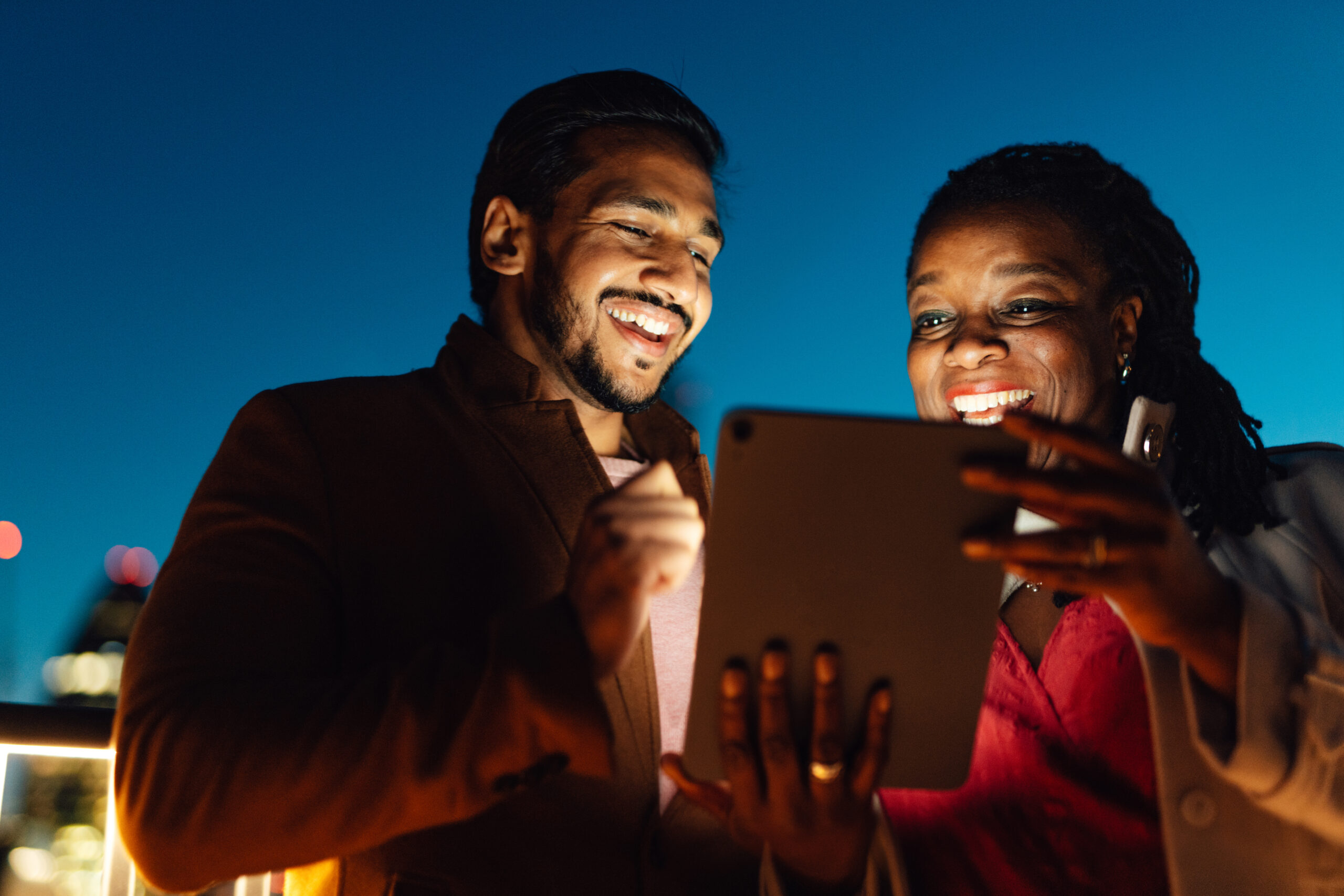 Close-up shot of two adults having video call on digital tablet against cityscape with colourful city lights and illuminated corporate skyscrapers in the background.