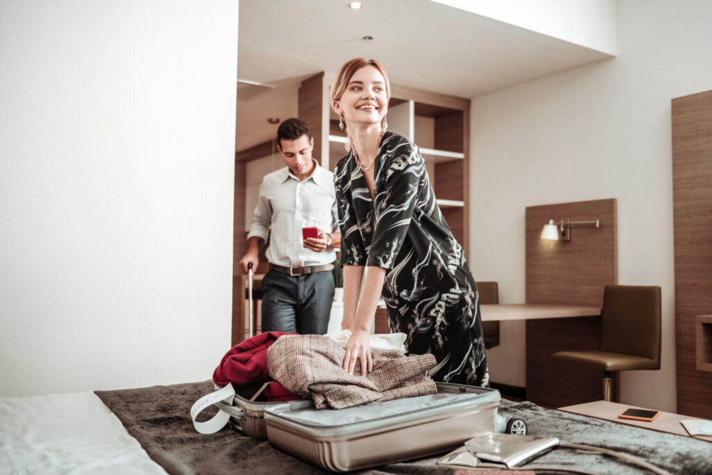 Clothes out. Blonde-haired wife feeling excited taking her clothes out of luggage having trip with husband